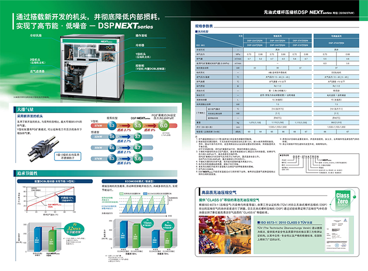新一代無油式螺桿壓縮機通過采用新開發(fā)的機頭,與現(xiàn)有日立空壓機型相比,最大可增加5.6%的排氣量,并徹底降低內(nèi)部損耗,V型機配置油PQ擴展模式,可以在降低工作壓力的條件下增加排氣量,實現(xiàn)了高節(jié)能,低噪音。
